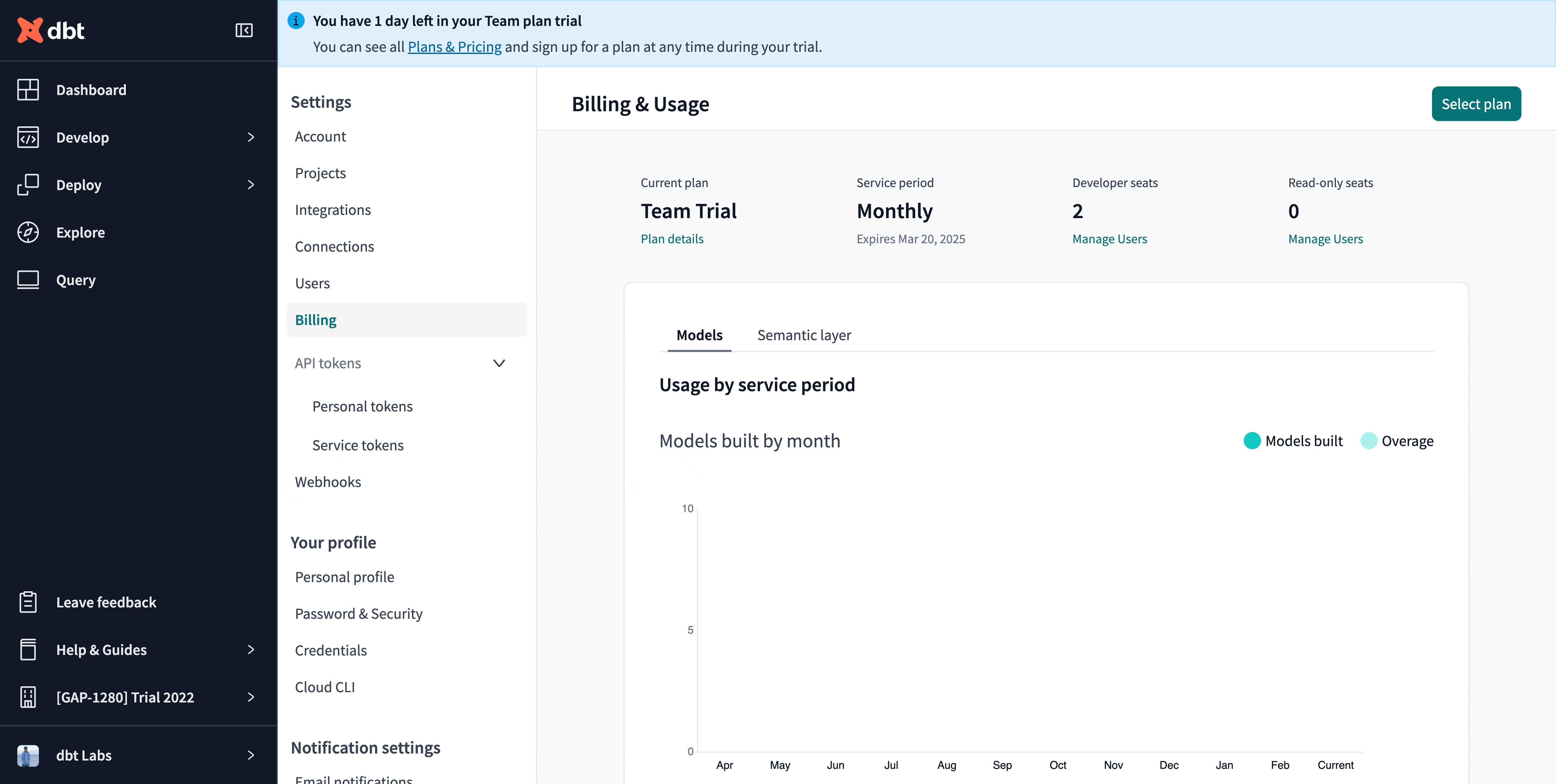 - Under Billing, you can review the available dbt plans and their features